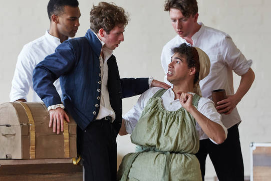 Dale Mathurin as John, Martin Bassindale as Prince Hall, Daniel Abbott as Mistress Quickly and Nicholas Gerard-Martin as Dericke in The Famous Victories of Henry V. Photo by Richard Lakos.